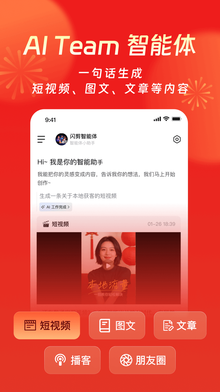 2026年初,备受瞩目的AI创作平台闪剪AI迎来一次重磅更新。这次升级不仅带来了节日氛围满满的【春节专属特效模板】,更推出了革命性的【AI创作】与【AI Team智能体】功能,真正实现了“一句话做视频、图文、歌曲等内容”的极致体验。无论你是零基础小白,还是资深创作者,只需像聊天一样说出你的想法,闪剪AI就能为你一键生成高质量内容,让你轻松打造个人影响力。